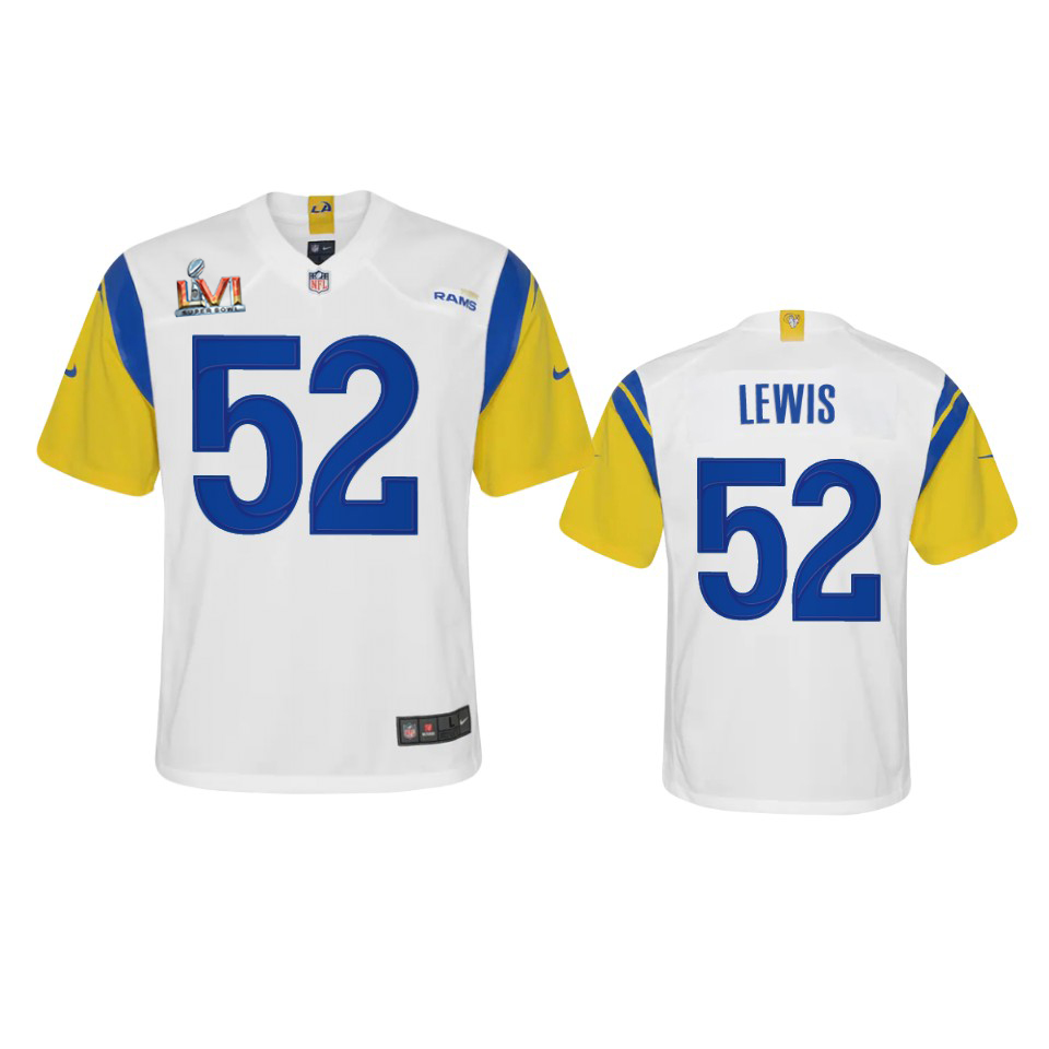 Behold this top notch Premium Los Angeles Rams #52 Terrell Lewis Youth Super Bowl LVI Patch Alternate Game NFL Jersey White With high demand Order now to wear your Rams pride With its high quality and stylish design it’s a must have for Rams fans Order now!