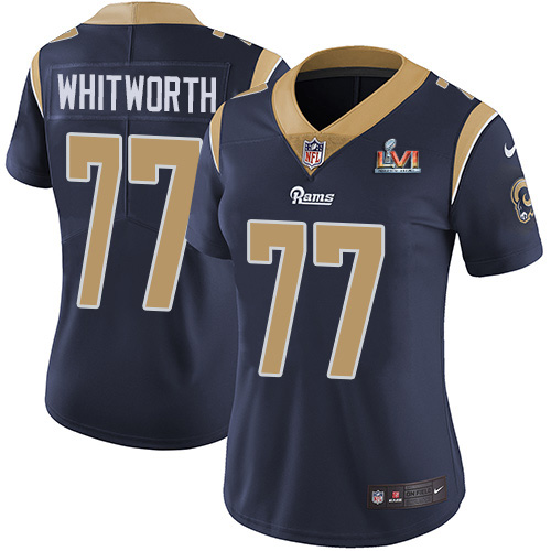 Delightful Rams #77 Andrew Whitworth Navy Blue Team Color Super Bowl LVI Patch Women’s Stitched NFL Vapor Untouchable Limited Jersey Be among the first to own Order your Rams stuff right away